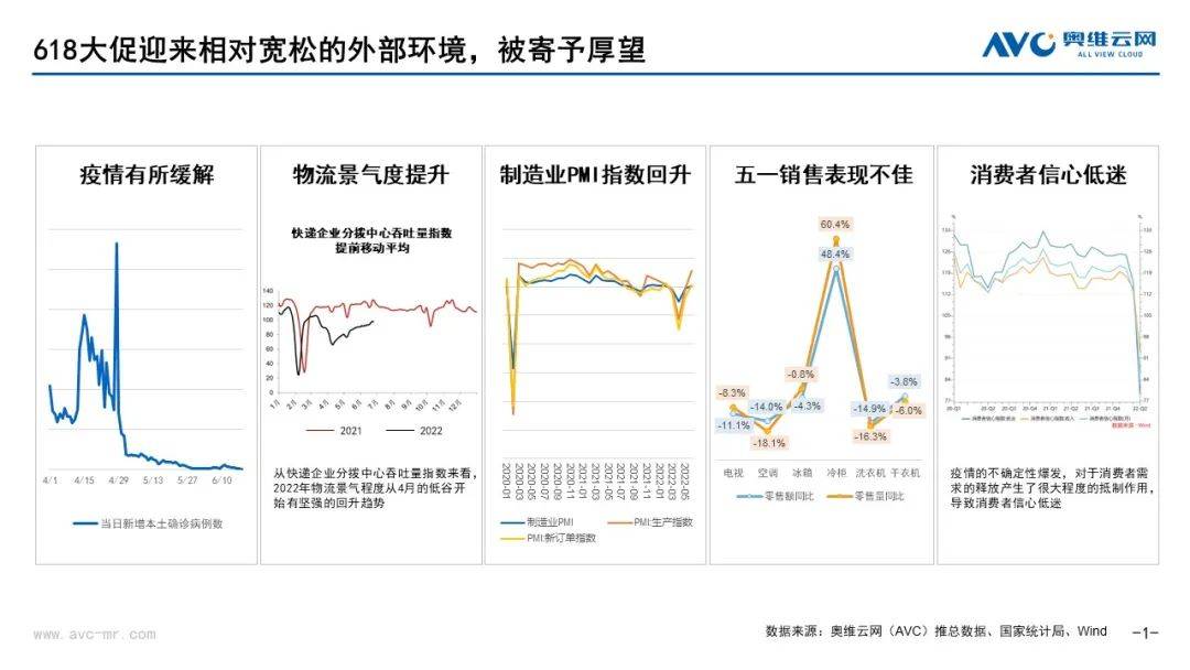 作为上半年的收官一战,今年618市场可以说是被行业寄予厚望。首先,上半年疫情起伏绵延,低迷的局面终于在五六月份得以控制和缓解;其次,全国物流运输被疫情阻断的情况也得以修复,为电商购物物流运输以及行业货源调配等都带来了充分利好;第三,家电制造业供给端显著修复,需求端也呈现向好的趋势,尽管总体而言供给端的修复仍领先于需求端;此外,五一促销期终端销售不达预期也令市场相信,囤积的需求会并入618促销期一同爆发,毕竟五一已逐渐沦为618促销期的前幕,呈现出了需求向618促销期聚集的趋势。因此可以说618促销期迎来了相对宽松的外部大环境,所以才承载了更多的期待。